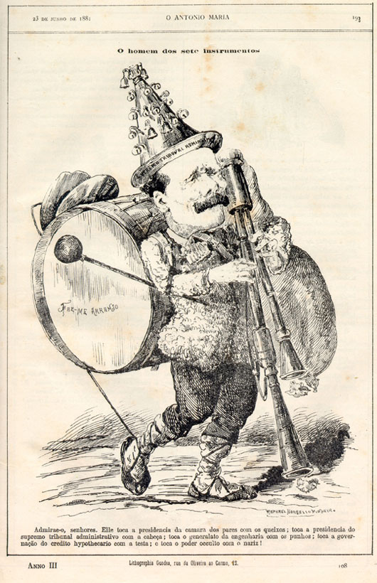 O homem dos sete instrumentos, 1881. Assinado: Raphael Bordallo Pinheiro. "O Antonio Maria", Ano III, nº 108, Lisboa, 23.6.1881, pág. 193.